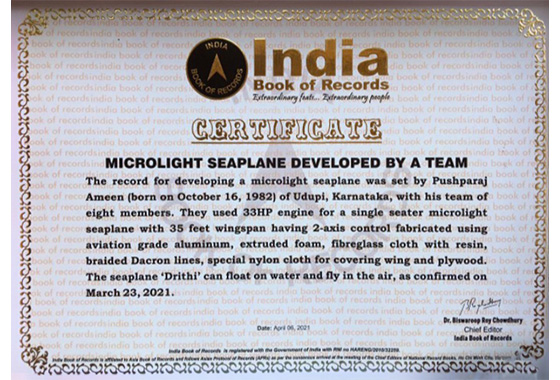 The aircraft was made using aviation-grade aluminium, extruded foam, braided Dacron lines, nylon cloth, fibreglass cloth with epoxy resin, and plywood. The length is 25 feet and the wingspan is 35 feet. The floats were made of composites, and the aircraft is powered by a Simonini Mini Evo 2 33-hp engine. COVID-19 delayed the project, so it wasn’t ready for the test flight until 2021. Pushparaj, despite his lack of experience, decided to perform the first flight himself. With the entire team watching, Pushparaj took off from a waterbody near his house and flew at a height of 15 feet. The entire flight lasted less than a minute. History was made that day, as it was the first microlight seaplane in India. Pushparaj has flown a total of 70 flights in his aircraft. Slow recognition came in the form of coverage in the local television and print media, which led to him receiving accolades from local politicians and social organizations. Pushparaj was also inducted as a special charter member of the Indian EAA chapter.